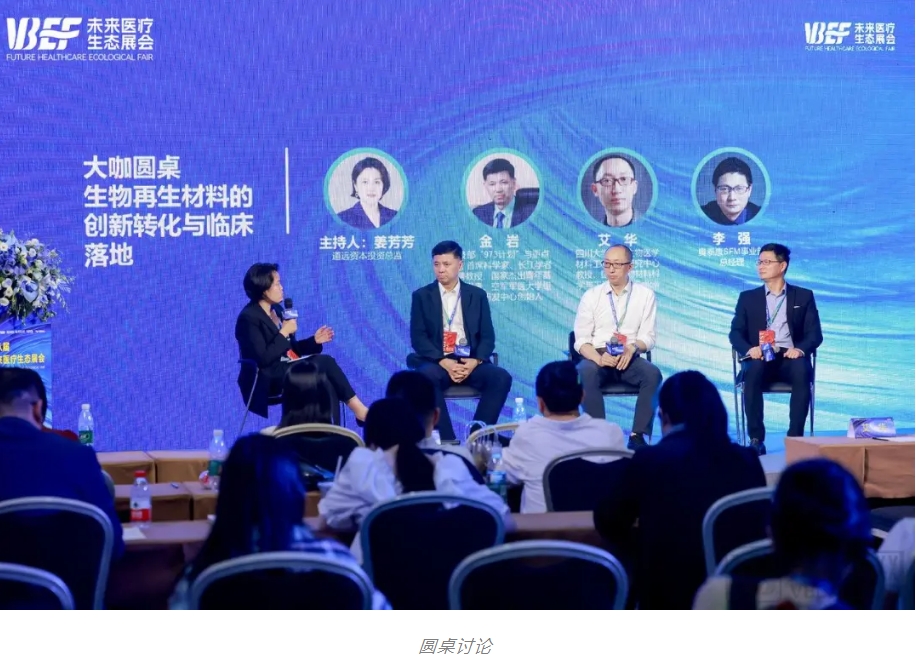隨后,科技部“973計劃”與重點項目首席科學家、長江學者特聘教授、國家杰出青年基金獲得者、空軍軍醫大學組織工程研發中心創始人金巖教授;四川大學國家生物醫學材料工程技術研究中心教授、國際生物材料科學與工程聯合會Fellow艾華教授;奧泰康SFM事業部總經理李強先生以及道遠資本投資總監姜芳芳共同圍繞《生物再生材料的創新轉化與臨床落地》這一主題進行了分享與探討。