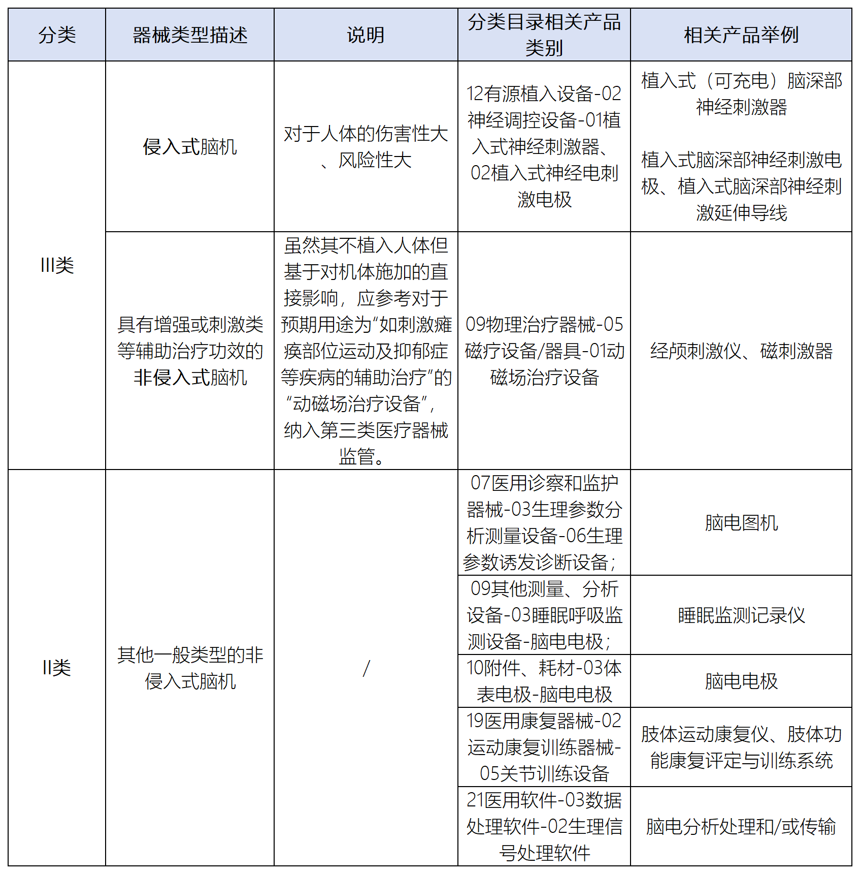 中國器審發(fā)布的《腦機(jī)接口的監(jiān)管現(xiàn)狀》指出,由于III類醫(yī)療器械在注冊難度、監(jiān)管要求、申請受理部門層級(jí)和申請時(shí)長等方面都遠(yuǎn)高于II類醫(yī)療器械,我國腦機(jī)企業(yè)目前大多選擇非侵入式采集技術(shù)路線。對于侵入式腦機(jī)設(shè)備,目前都處在臨床性研究和動(dòng)物實(shí)驗(yàn)階段。目前暫無公開性的由國家藥品監(jiān)督管理局正式批準(zhǔn)進(jìn)入人體臨床試驗(yàn)階段的侵入式腦機(jī)器械。根據(jù)廣義BCI的定義,結(jié)合我國現(xiàn)行《醫(yī)療器械分類目錄》的規(guī)定,與BCI相關(guān)設(shè)備的分類主要為II類和III類: