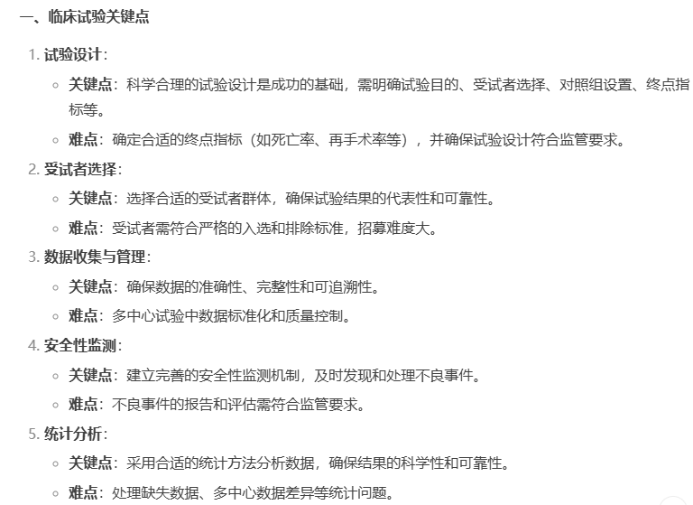 然而,每一項創新技術的臨床應用,都離不開嚴謹的臨床試驗驗證。心臟瓣膜醫療器械的臨床試驗和注冊申報是一個復雜且嚴格的過程,其中涉及的多個關鍵環節和潛在難點,關于這些,看看當下最熱門 AI工具deepseek怎么說吧~