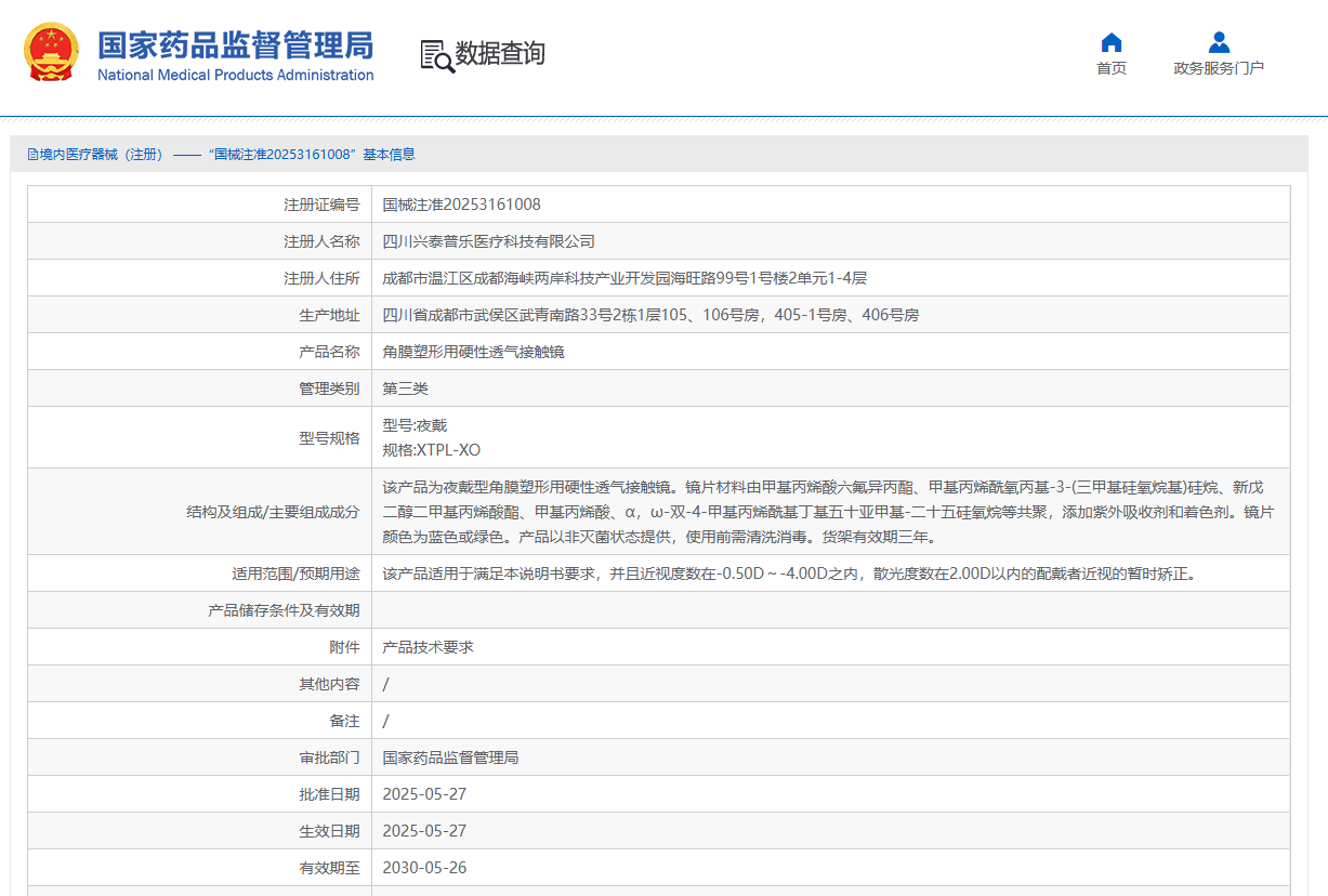 奧泰康助力興泰普樂「角膜塑形用硬性透氣接觸鏡」獲批上市2025年5月27日,經國家藥品監督管理局公示,四川興泰普樂醫療科技有限公司的角膜塑形用硬性透氣接觸鏡(國械注準20253161008)獲得NMPA批準上市,奧泰康負責本項目臨床試驗工作。